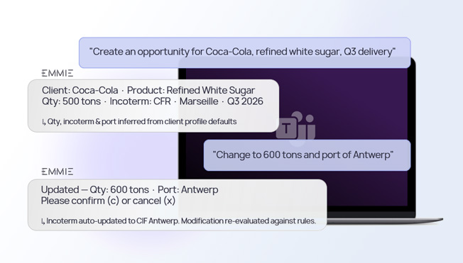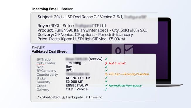 Emmie connects to your emails, chats, documents, CRMs, ERPs, CTRMs, and internal platforms to operate across your full environment.